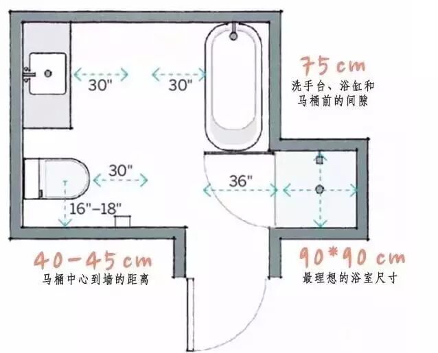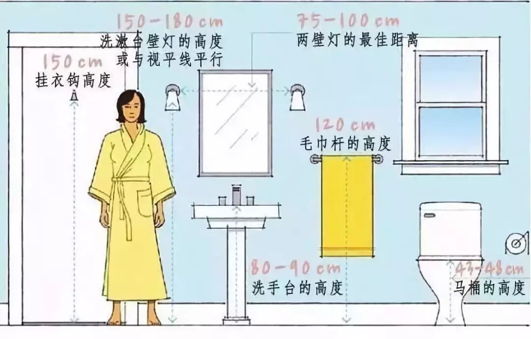 卫生间各个操作台的相对距离: