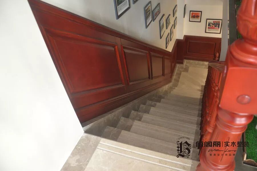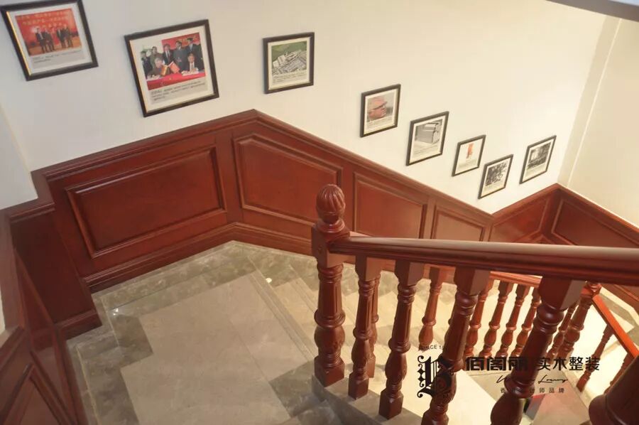 一楼与二楼间,映入眼帘的便是一款欧式风格的实木楼梯,其漆面光滑红润,款式简洁大方,精品时尚,而与其对应的半身墙裙线条简约流畅,二者搭配浑然天成。