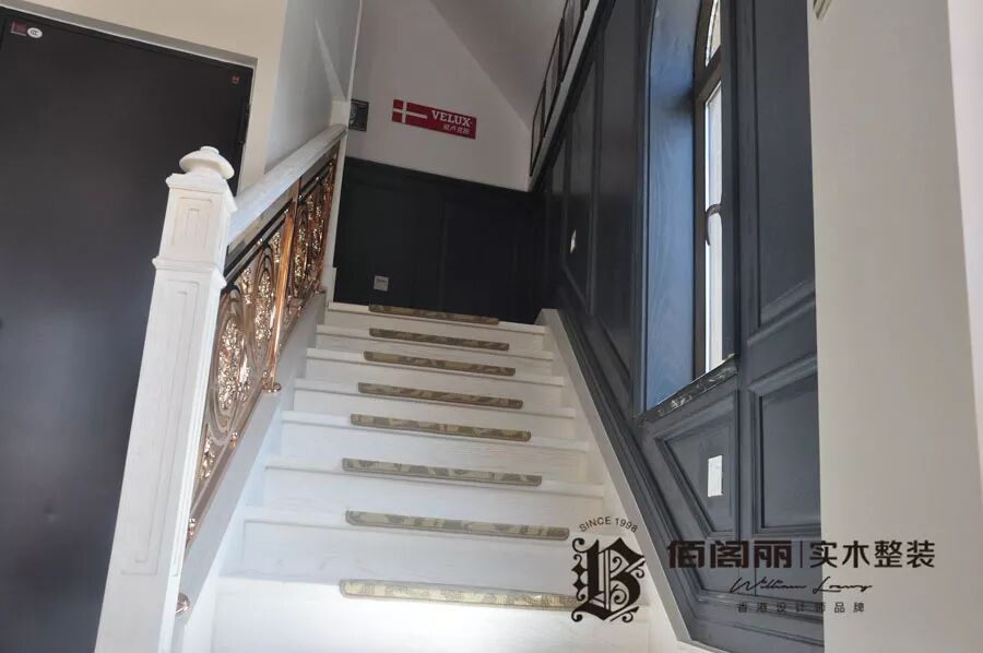 会议室另一端,一座欧式风格楼梯闯入眼帘,白色实木扶梯与金属镂花工艺的结合,干净简洁之中彰显高端品质,再加上宝蓝色护墙板的衬托,鲜明的色彩对比,给人以奢华而不失清凉的感官享受。