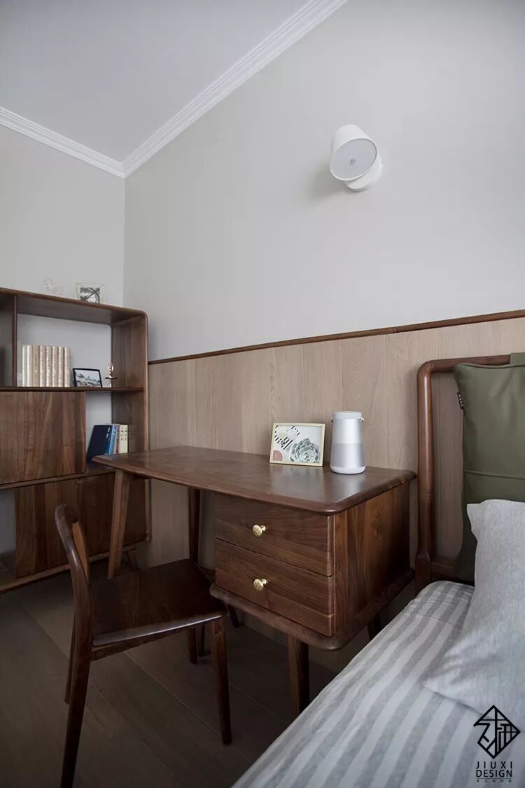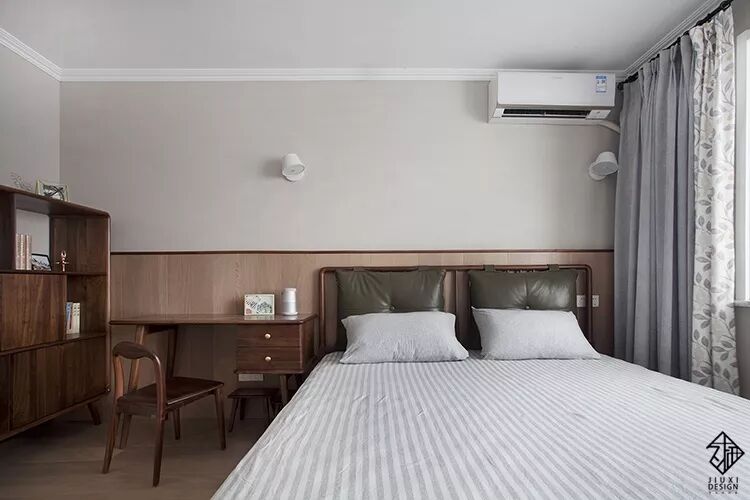 在床头部分,实木地板上墙的点缀处理,自然的质感纹理让整体空间变得更加柔和,简单实用的硬装材料不失温馨惬意。丰富层次的同时,还降低室内的用色饱和,利于睡眠气氛。