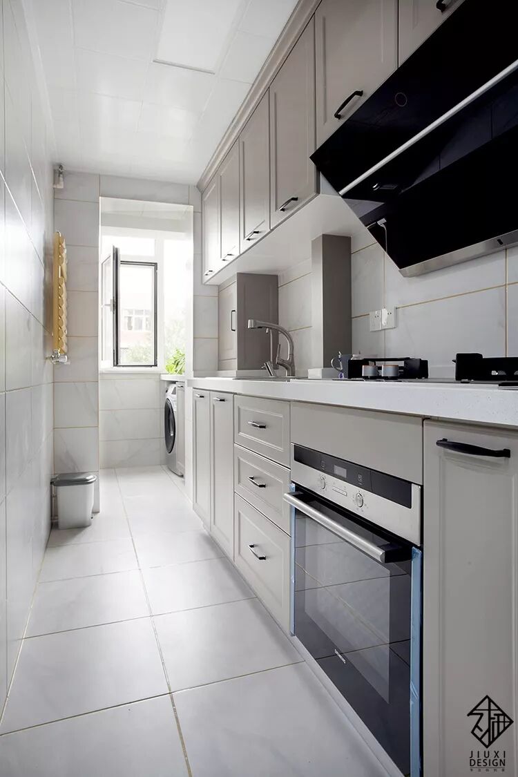厨房的净宽尺寸是1.4米,只能让厨房只能做成直线橱柜。设计为总长3.4米的橱柜,让收纳得到了充分利用。其中阳台1.2米的部分是做洗衣机的位置,也成了一处不错的小晾晒区。柜门以及两根包管位置,选择的是吸塑板,造型精简单,最方便日常打理,暖灰色的柜体与大面积的白色墙砖层次分明,美缝的颜色与挂在一边的柠檬黄散热片形成呼应。