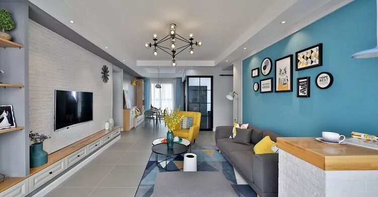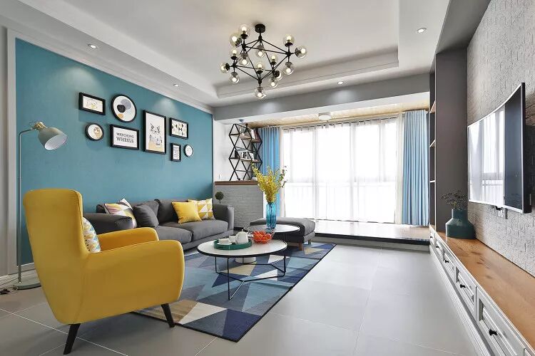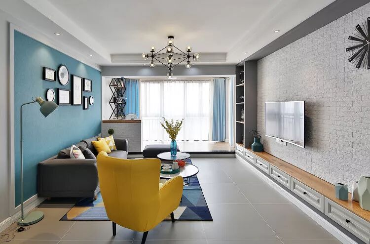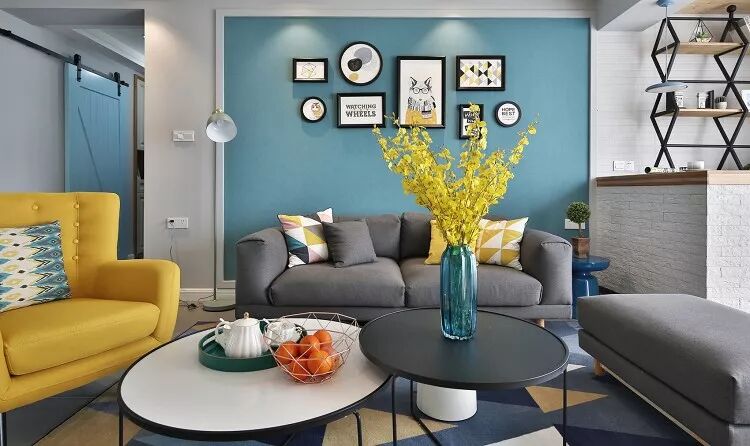 沙发背景材质是蓝色墙纸,三人沙发选择深灰色布艺面料。