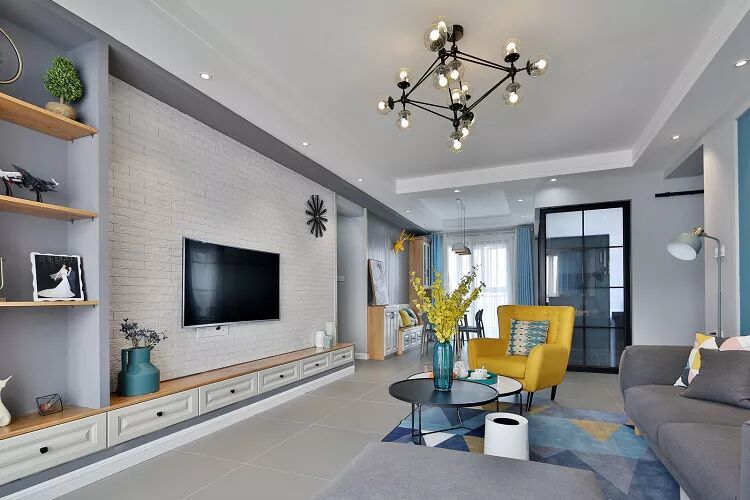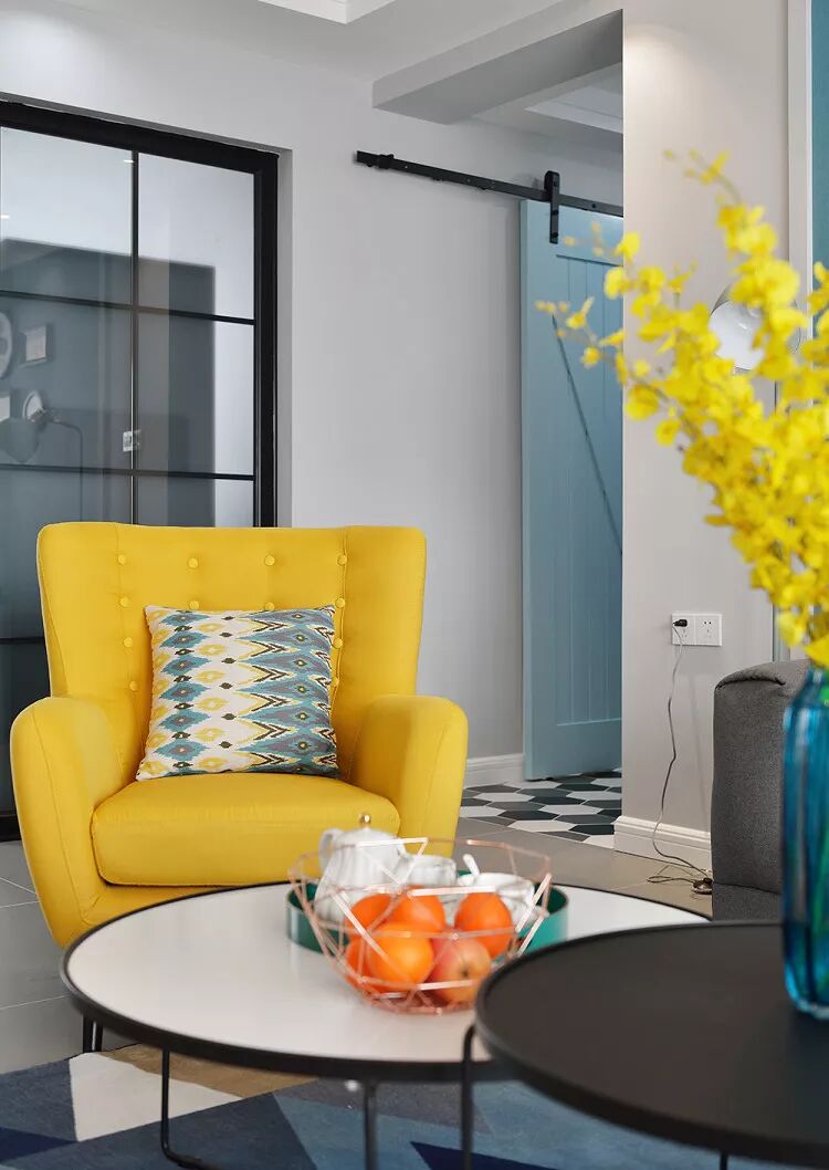 地毯选择与墙纸和窗帘同色系的几何图案,单人沙发椅和抱枕选择明黄色,提升了整个空间的亮度和温度。