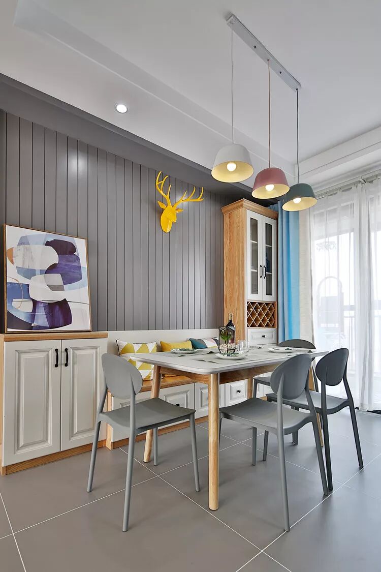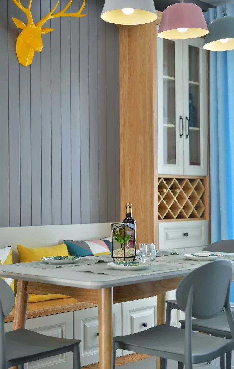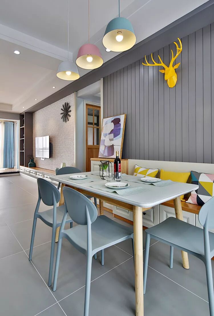 餐厅卡座设计解决空间不足问题,灰色墙板与地面灰砖让空间安静内敛,黄色鹿头亮化餐厅氛围,让就餐更有食欲。
