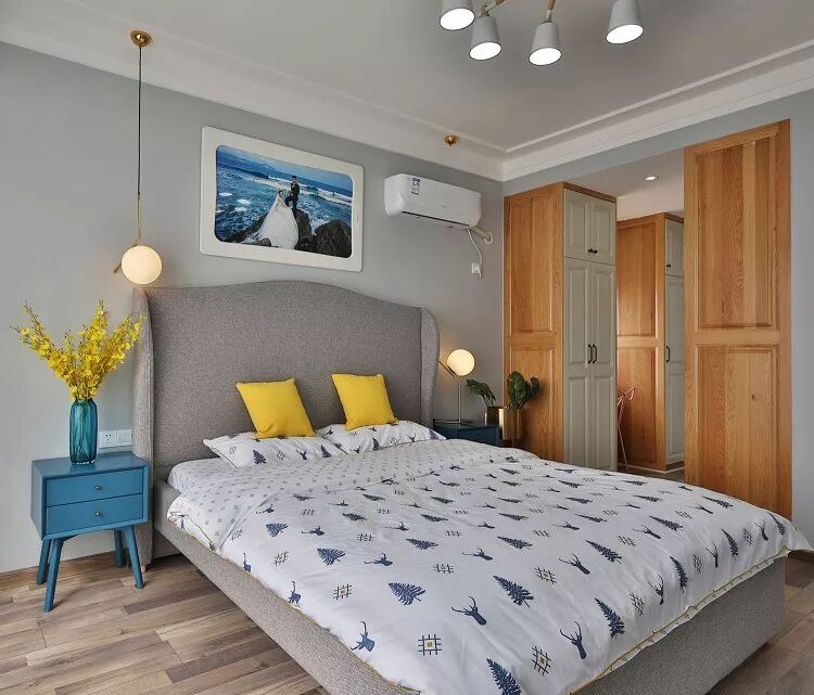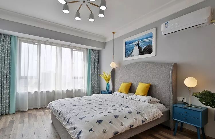 原始飘窗拆掉后,卧室空间明显开阔很多,床头柜上吊灯和台灯样式简单+金色,是一个组合系列,对称美的不呆板。