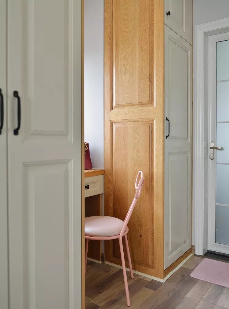 进入卫生间的衣帽组合柜是定制的,跟餐厅的柜体配色一致,木色+白色浅显的很自然,不浓烈不冷淡,刚刚好的温暖。
