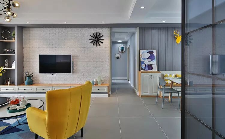 进门处看客厅和过道,电视墙与卡座背景通过灰色装饰板连接在一起。