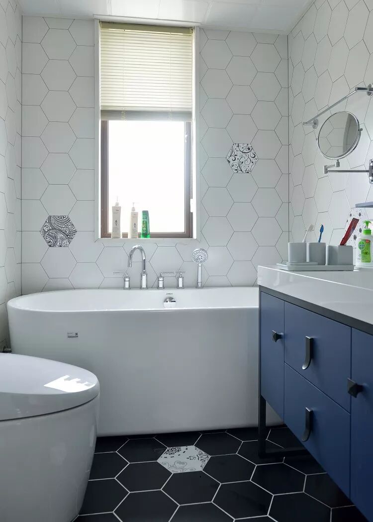 主卫生间墙面和地面用的是北欧风的六角砖,墙面白色,地面深蓝色。几片黑白图案的花片砖点缀,让空间独特俏皮有趣。