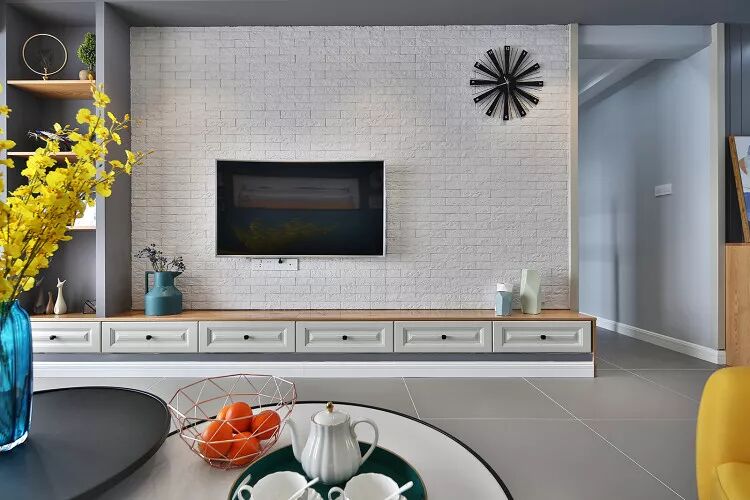 左边装饰柜与右边卡座墙颜色平衡统一,让整个客餐厅视觉感更加整体大气。