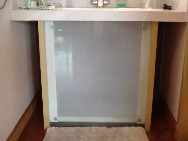 △浴室台盆下面的柜子设计成了这种打不开的样子,既占地方又不实用,真是浪费人力物力。装修工人就不能上心一点吗。