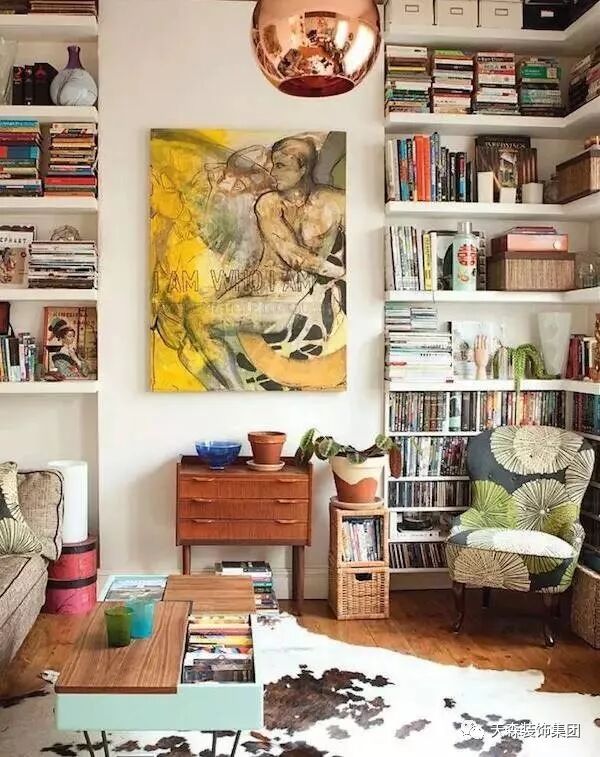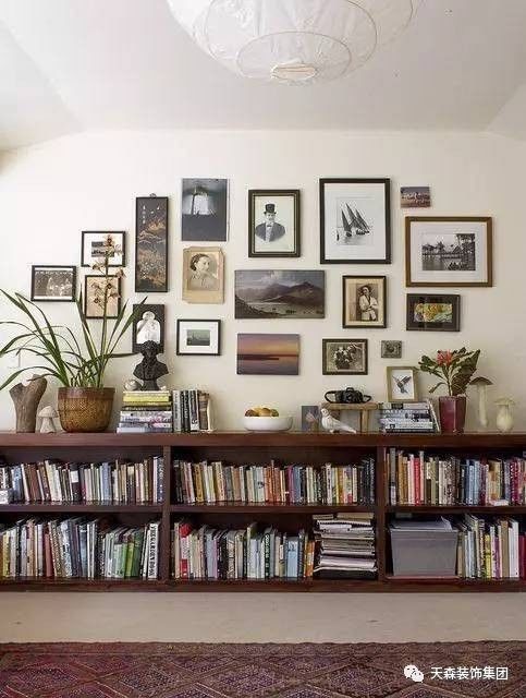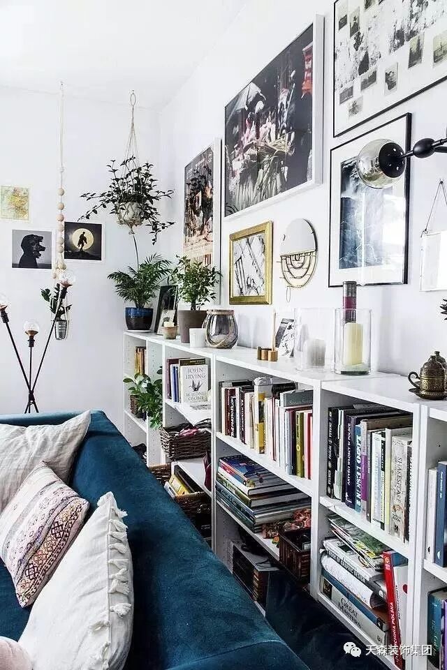 当然,如果想增加收纳空间,可以通过书架+画的组合,实用还美观。