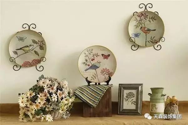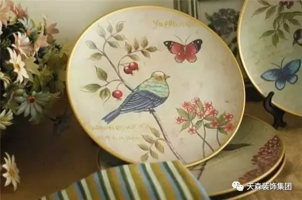 这款挂盘,以鸟、蝶、花为主题元素,呈现出了生机勃勃的田园风格。挂盘搭配的卷曲铁架更突显了北欧田园的特点,与木质家具相得益彰。