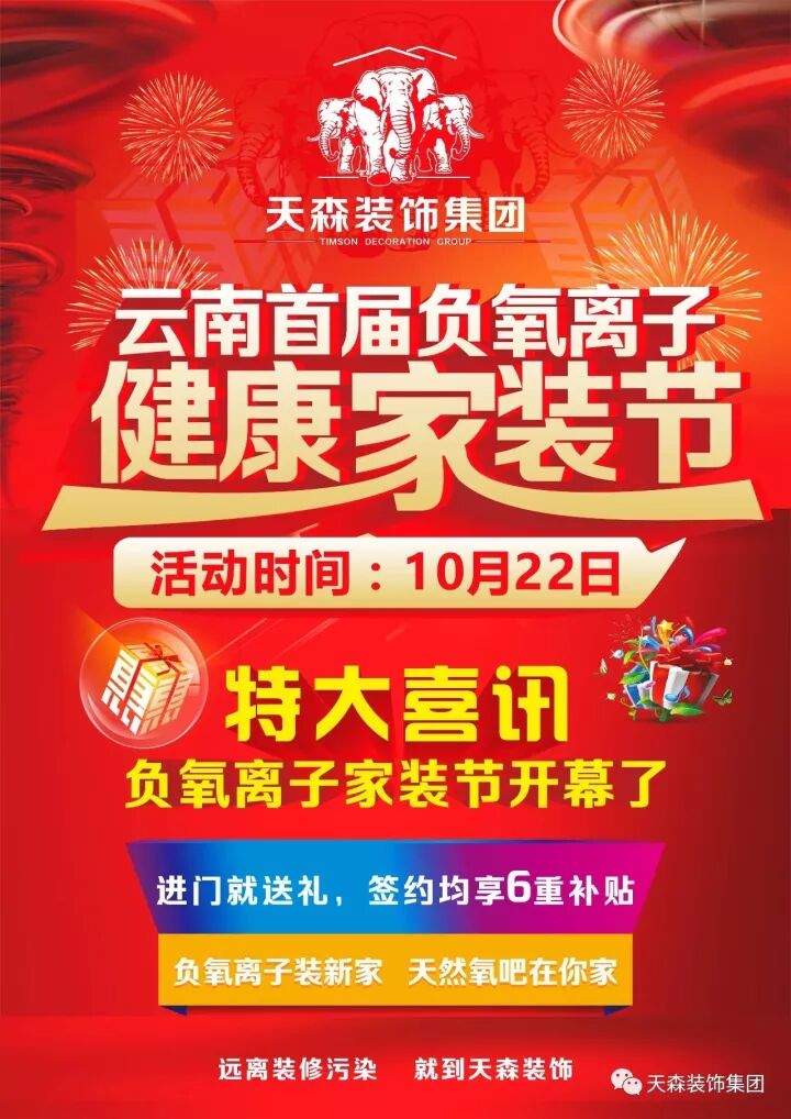 天森为了让更多家庭能真正享受负氧离子健康家居生活,十月呼朋唤友定装修,汗水与热情汇聚,凝聚一切为天森新老业主打造健康家装。天森装饰集团联合众多负氧离子品牌,2017年10月22日共同举办云南首届负氧离子家装节,圆所有老百姓一个健康家装梦。