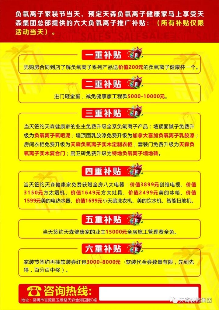 负氧离子家装节当天,预定天森负氧离子健康家马上享受天森集团总部提供的六大负氧离子推广补贴: