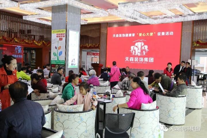 2017年10月13日,天森装饰在金海国际举行了天森健康家“爱心大使”征集活动,活动受到了到场嘉宾一致好评。“天森健康家爱心大使”计划,是我们发起的公益倡议行动。让广大群众重视健康装修、净醛装修的紧迫性和重要性,到场的每一位嘉宾都可以成为我们的爱心大使,每个人都可以把健康的人居知识传播出去。星星之火可以燎原,我们把健康家的种子种到每个人的心中。