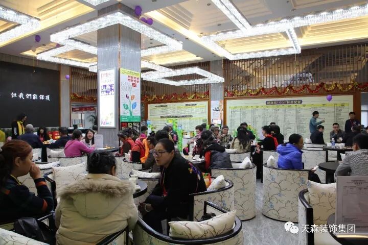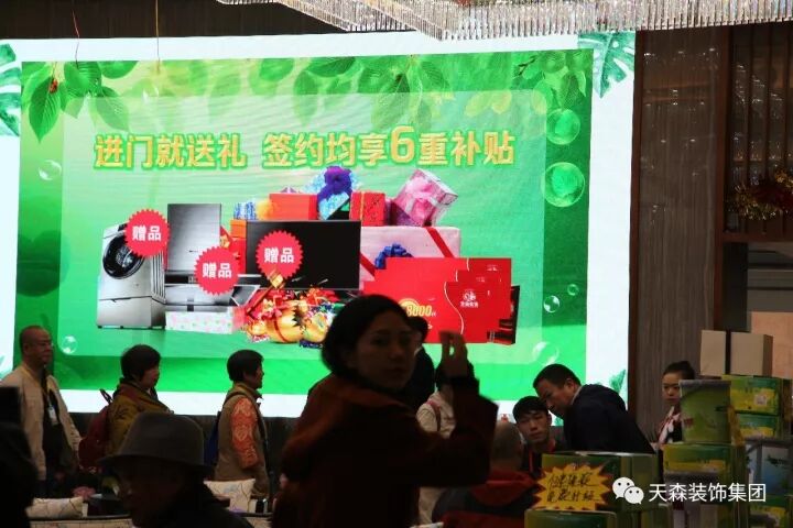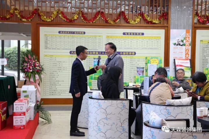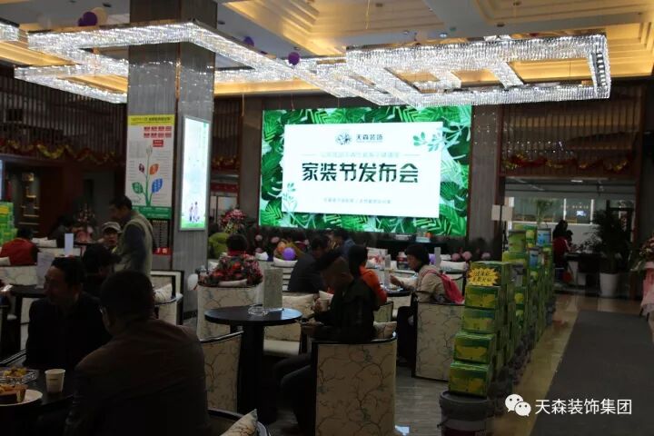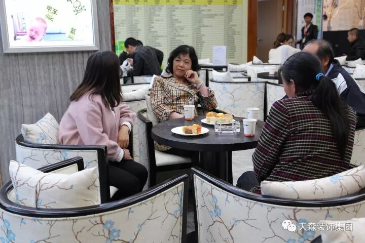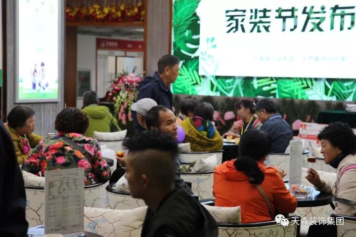 大厅内一片热火朝天的景象,宾客们在享受精美点心、水果的同时,亲眼、实地感受天森装饰的企业文化、发展历程以及天森的负氧离子健康家装,一片绿色的环境中仿佛感受到负氧离子扑面而来。