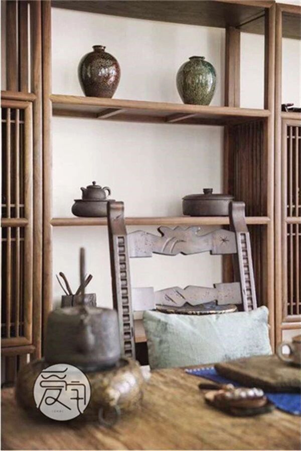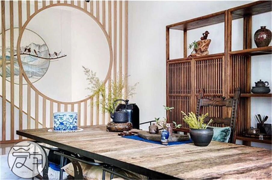 步入茶室休闲空间,完整荒料修复而成的雕花门型隔断,粗粝质朴,雅致的氛围置有原木凳与树根茶桌,几分质朴、几分雅趣。去营造出一个带有禅味的休闲茶房。