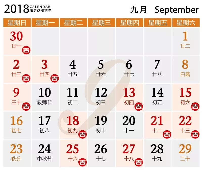 公元2018年09月30日 农历08月(小)21日 星期日 天秤座 农历戊戌木年 八月小 廿一日