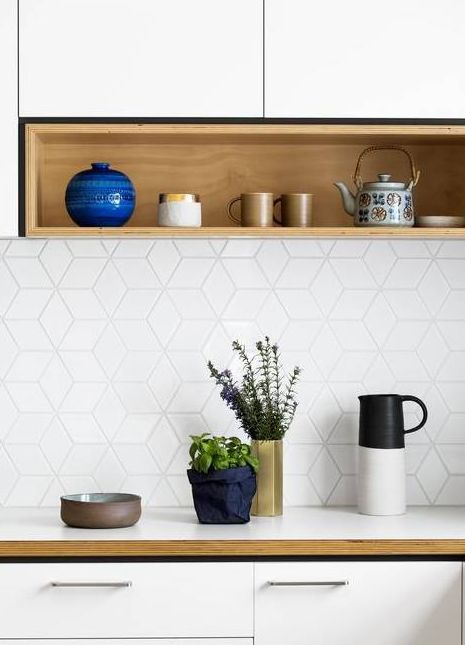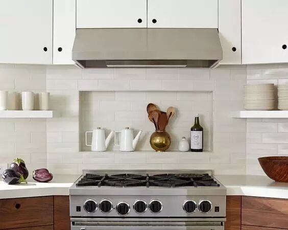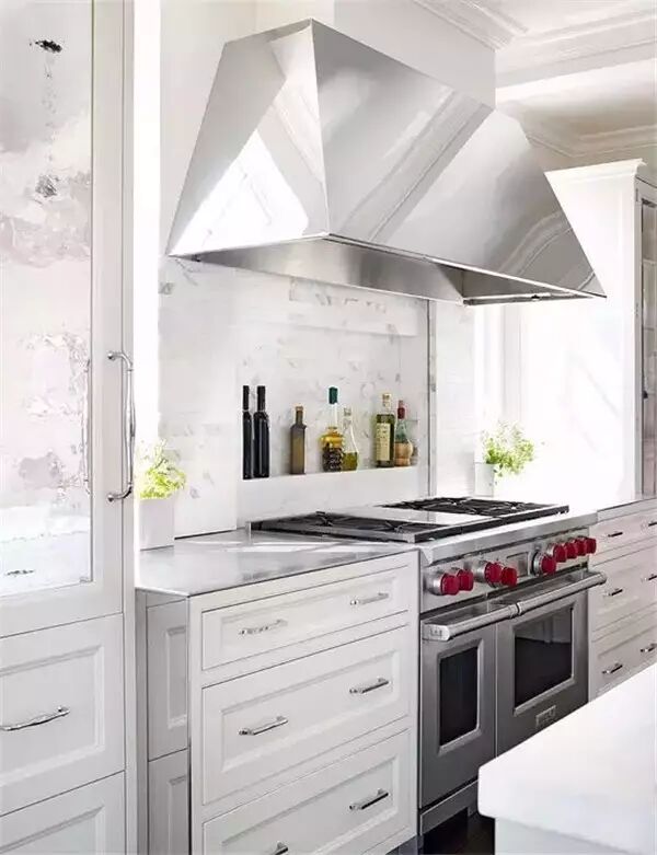 厨房讲究的是方便、美观、实用、设计一个壁龛,放一些碗盘子和各种瓶瓶罐罐。
