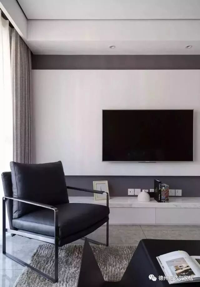灰白电视背景墙具有层次感,单椅,茶几摆放随性,麻质毛毯增添舒适度。
