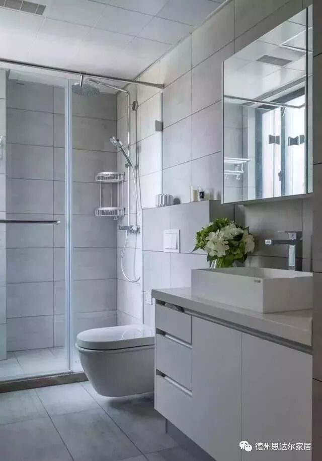 卫生间的地面与墙面整铺水泥灰瓷砖,墙排马桶,玻璃淋浴房,简单且实用。