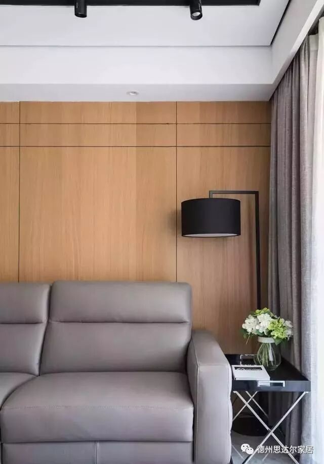 木饰面背景搭配皮质的沙发,营造出简约舒适的视觉氛围。