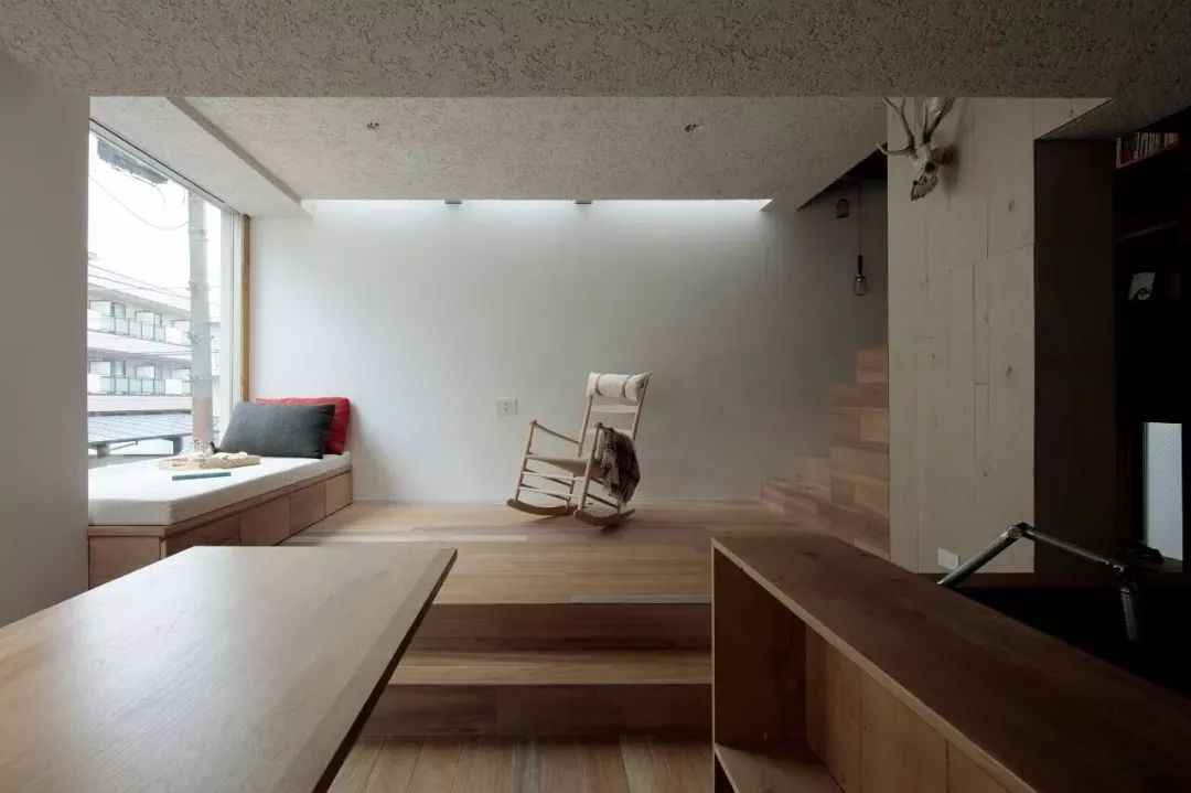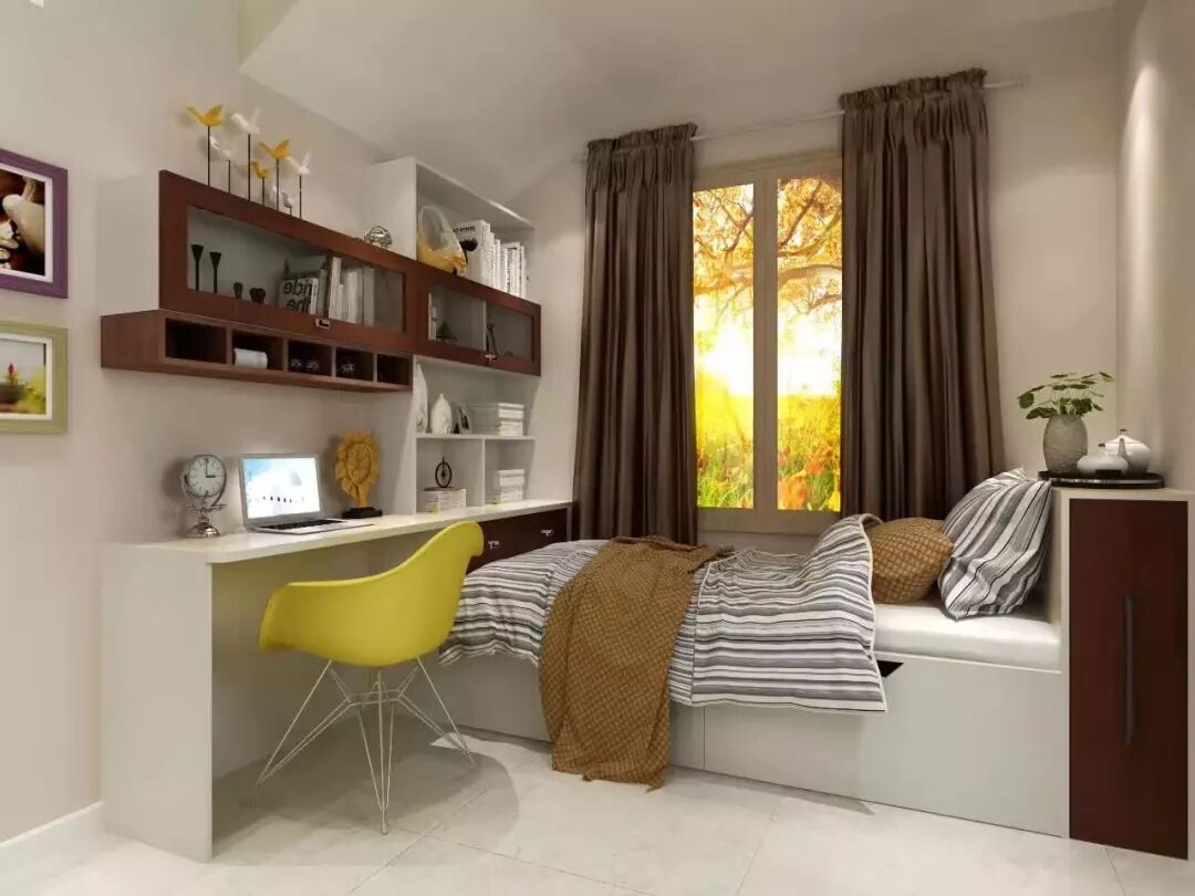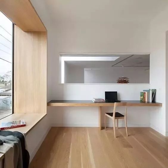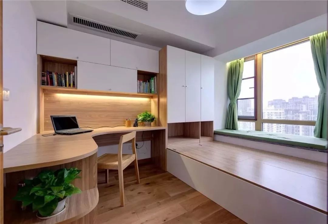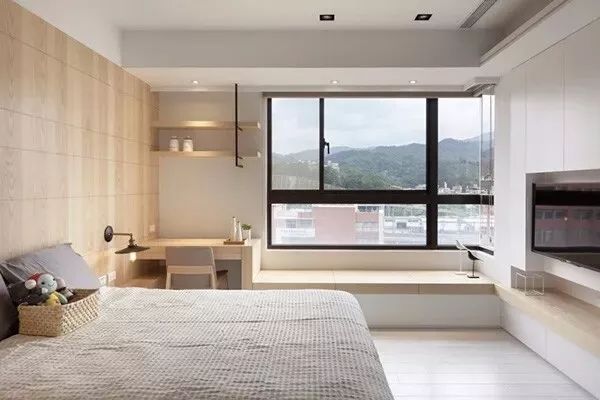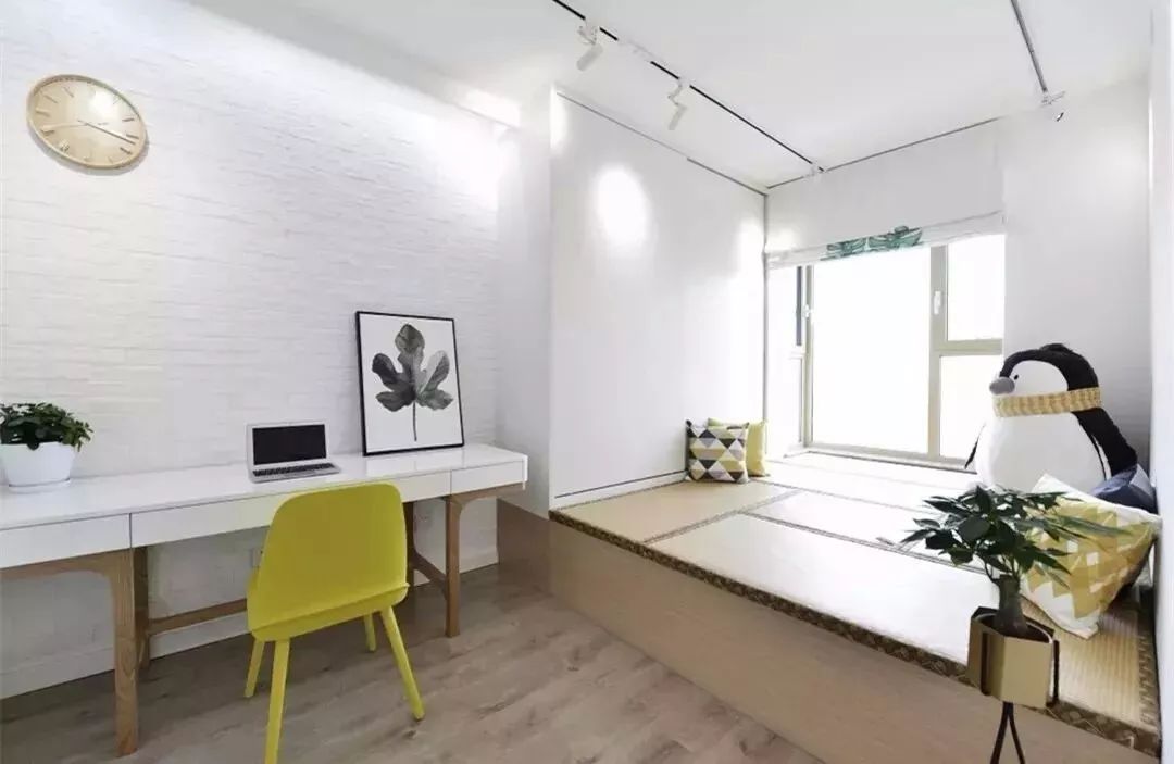榻榻米作为基本的休闲空间,抬高其整体的底部,用一张长搁板当临时书桌,整个空间层次感十足,就算是小空间,也有了嬉戏打闹的娱乐场地。