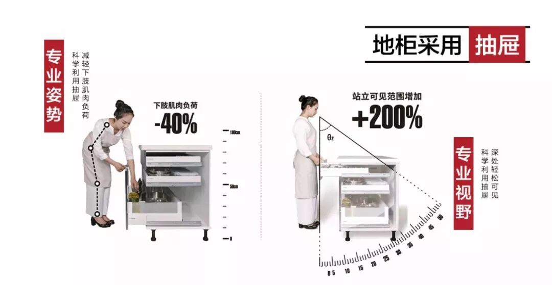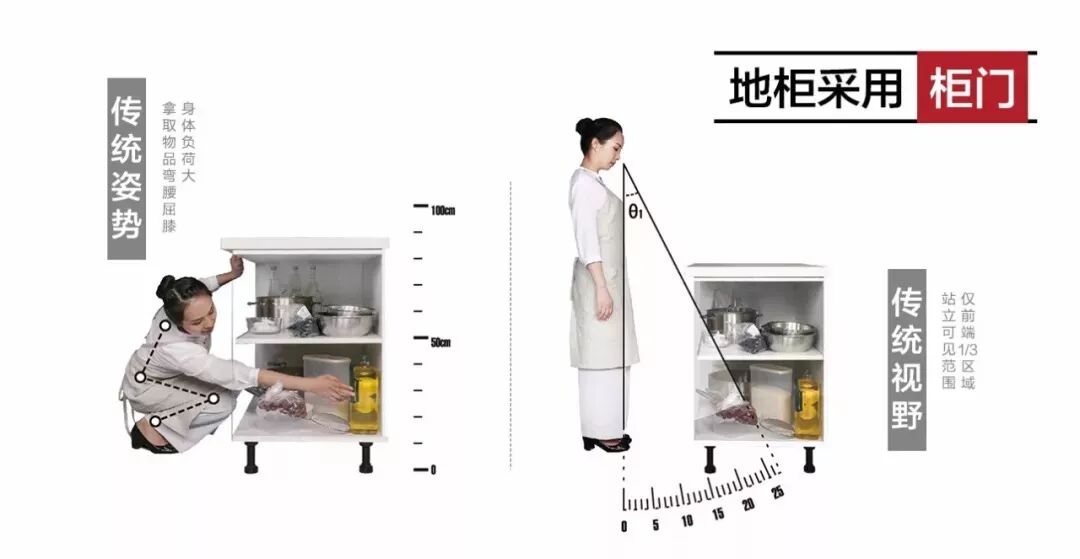 而在于地柜,很多家庭目前的装修都是在厨柜里装一块层板,每次在里面找东西的时候就是下蹲→打开柜门→俯身进去翻找,在漆黑的厨柜里能不能找到全拼眼力;