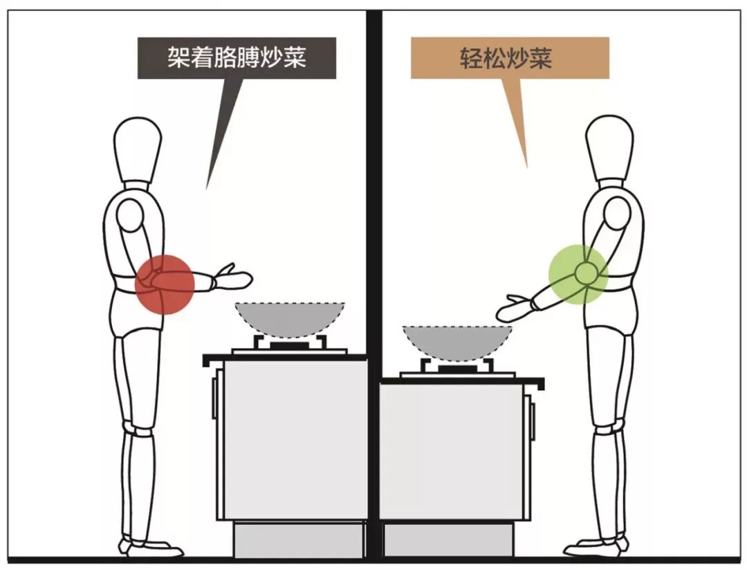 传统的厨房设计,往往都是按照统一的高度来装厨柜灶台的,而每个人的身高习惯都有所不同,如果做饭的人身高与厨柜高度不一致的话,就会出现架着手炒菜、弯腰俯身洗菜的情况,做一顿饭下来胳膊手都酸痛了。