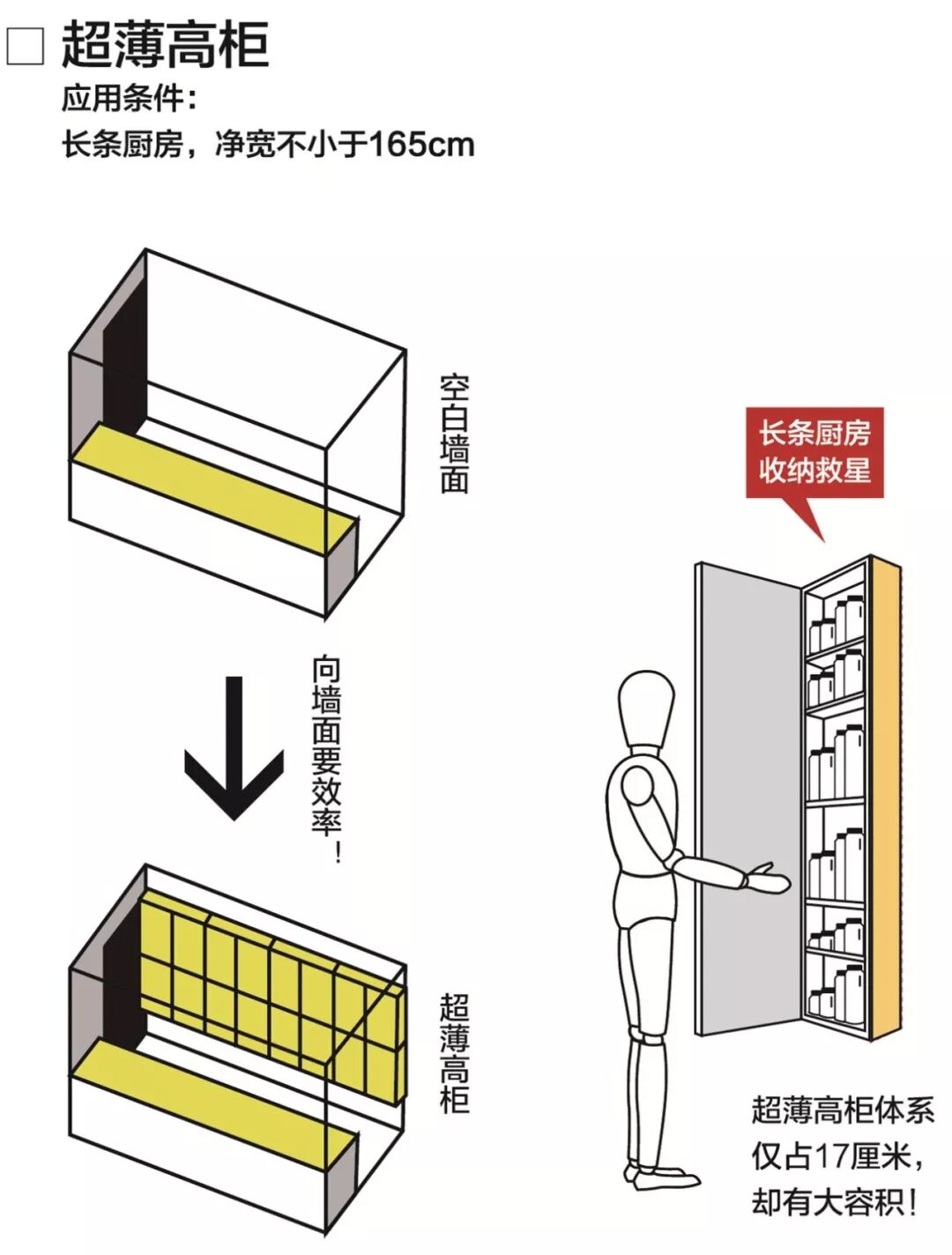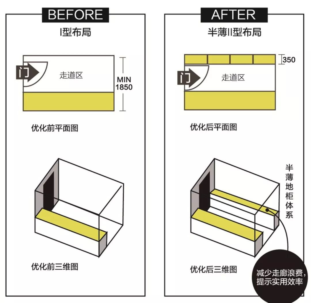 经过增加一排的薄柜,厨房的布局也可以可以从Ⅰ字形的厨房变身Ⅱ字形的厨房,经过这么优化,不仅增加了厨房的收纳,厨房的操作动线也相应地缩短,真的是非常巧妙的设计。