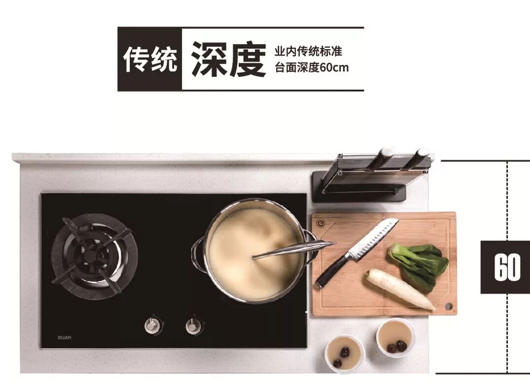 传统装修在做厨房台面进深的时候,一般都以60cm来设计的,而装上灶具后,一般灶具外侧都会留下一条碗都放不下的边线空间,非常的鸡肋浪费。