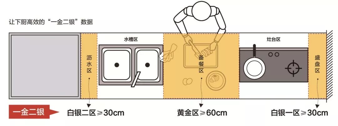 而在动线的基础下,每个动线之间留出足够的操作台面也是非常重要,否则动线再好,洗好的菜跟出锅的菜没地儿放,还是要来回走动,下图是各个操作区需要预留的尺寸参考。