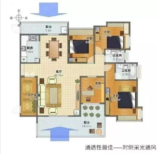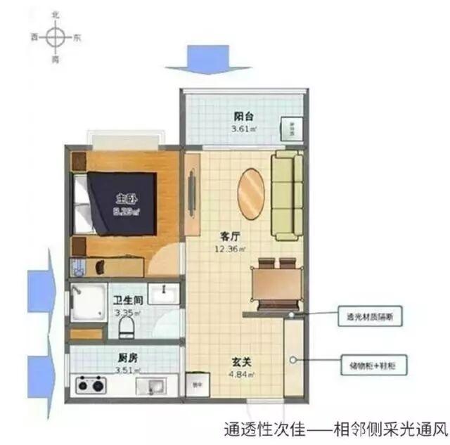 2、户型最好有两面可以采光和通风,相对两面采光通风最佳,如南北、东西。