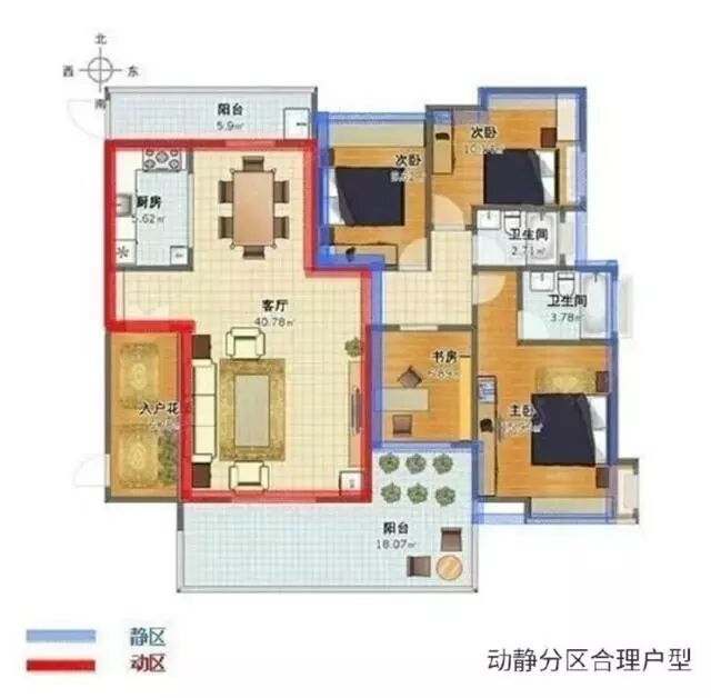 1、动区:客厅、餐厅、厨房、次卫等等,活动较为频繁的区域,应该靠近入户门,尤其是厨房位置