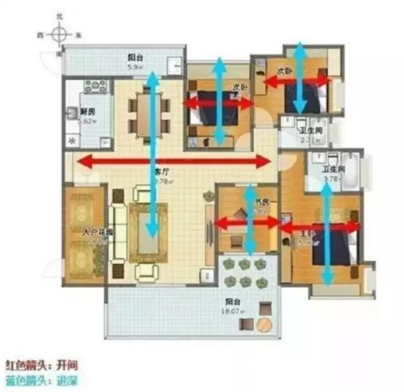 2、静区:卧室、书房、主卫等,应当尽量布置在户型内侧。