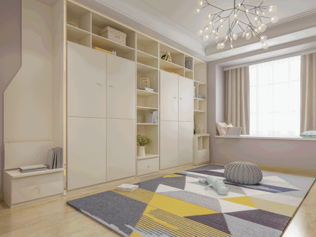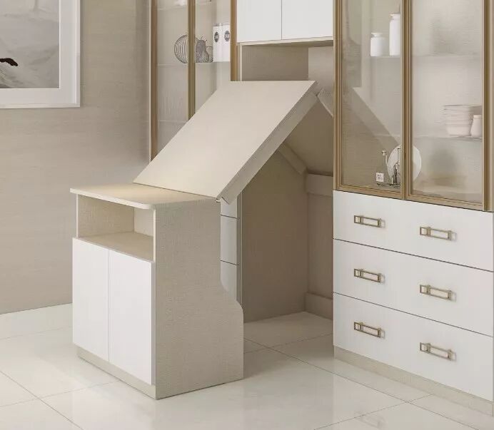 上翻折叠移动桌在底部装了定向滑轮,推拉顺畅,变形轻松。放下来时,可以当餐桌、办公桌。一侧还设置收纳柜,用来收纳餐具、调味料等小物品。用完收起来,则腾出了一大片空间,铺上地毯,小孩和大人都能愉快玩耍啦。