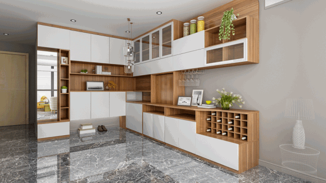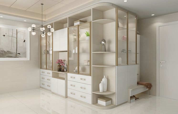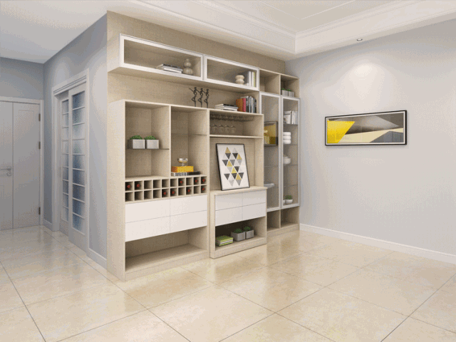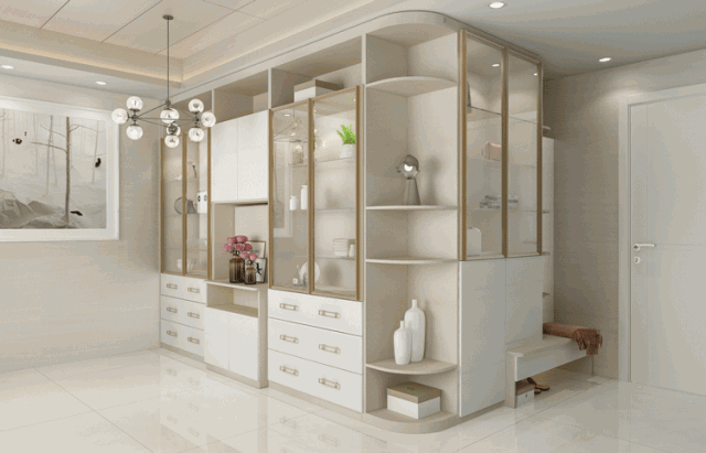 接下来隆重登场的2号网红是东哥家的餐厅。为了更好地利用转角空间,东哥将入户柜和餐酒柜进行一体化设计。家里有一个一岁多的小孩,考虑到安全问题,转角展示柜采用圆弧形,避免小孩磕碰受伤。