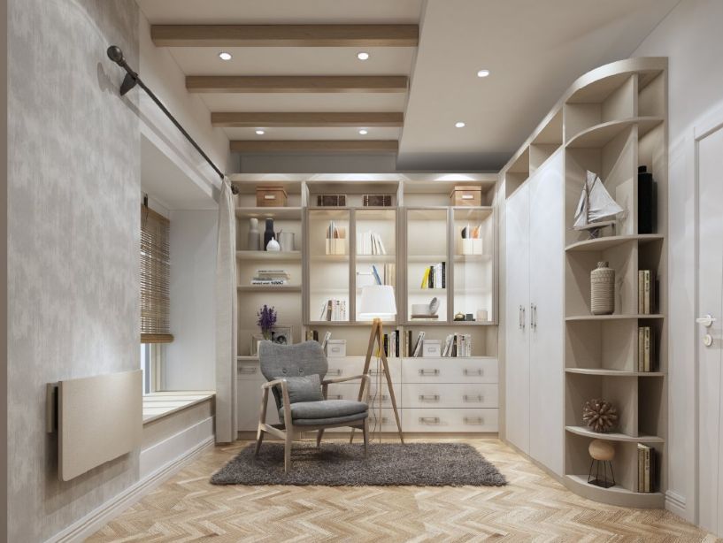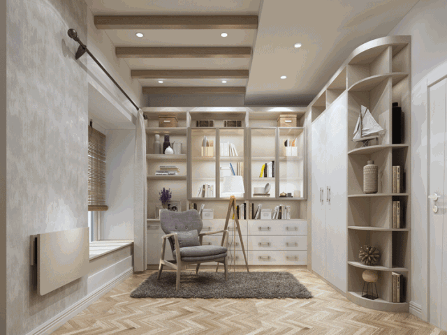 这是业主陈小姐家的书房,她和老公都很喜欢看书,暂时不打算要小孩,所以把家里的次卧改造成书房。风格选择了现代简约风,柜子和窗帘都是浅色系,视觉上非常舒服。