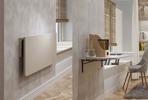 首先在墙上装了一个折叠上翻台,放下便是小巧的办公台,占地面积小,使用灵活。适用范围也非常广,墙面、护墙板、柜体都能装。