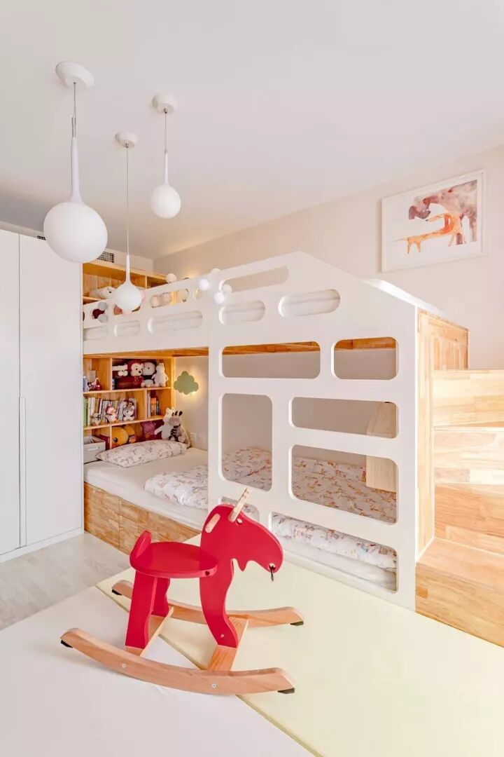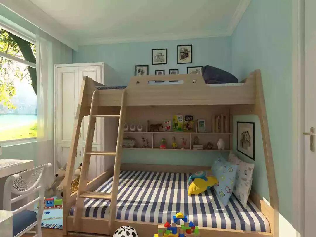 二孩房家庭首先推荐上下床 ,发展上层空间,面积偏大的主卧室改为双人儿童房 ,中间用隔断或实墙隔开也很可行。