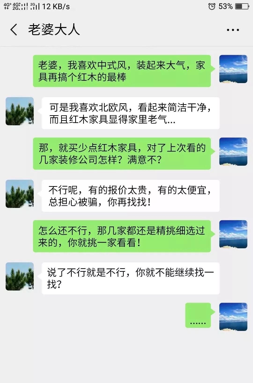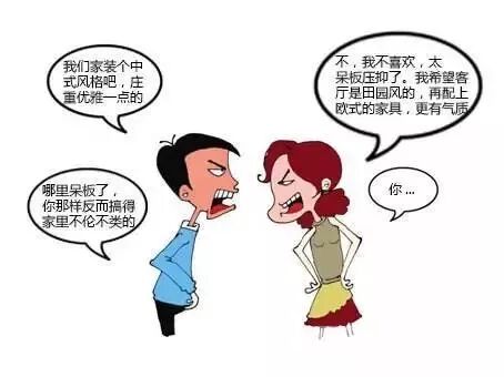 装修涉及的品类较多,大到装修风格、材料选择。小到一盏灯、一颗螺丝钉。再到后期使用地板还是瓷砖,墙纸选什么颜色、电器选什么牌子等等,某一方看了好久很喜欢的东西,另一方却觉得贵了,要换!都随时会引发争吵,尽管最后必然有一方妥协,但却满腹牢骚,仿佛埋着一颗不定时炸弹,“你看,就是当初你选的吧!问题来了吧!”