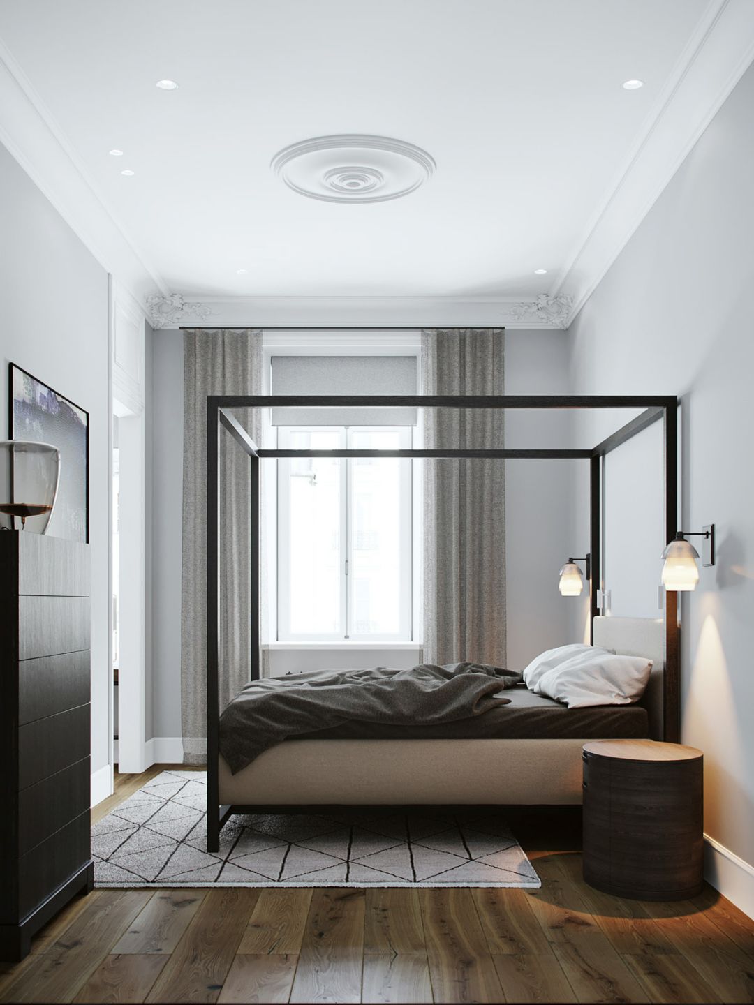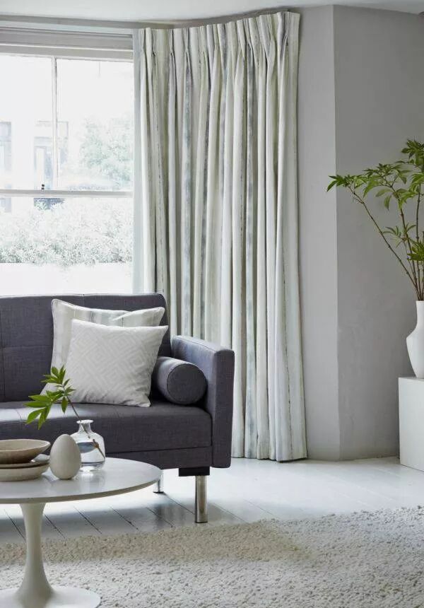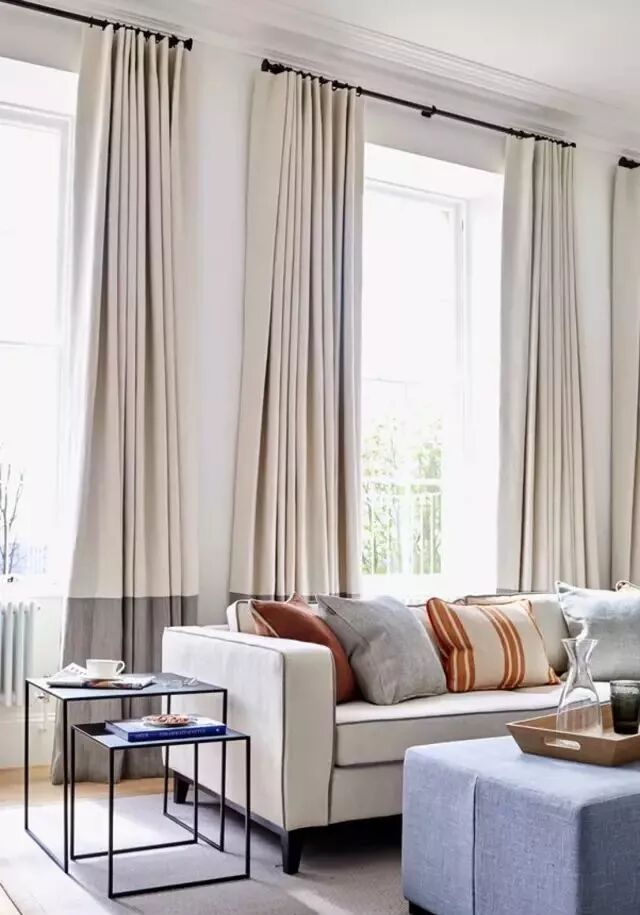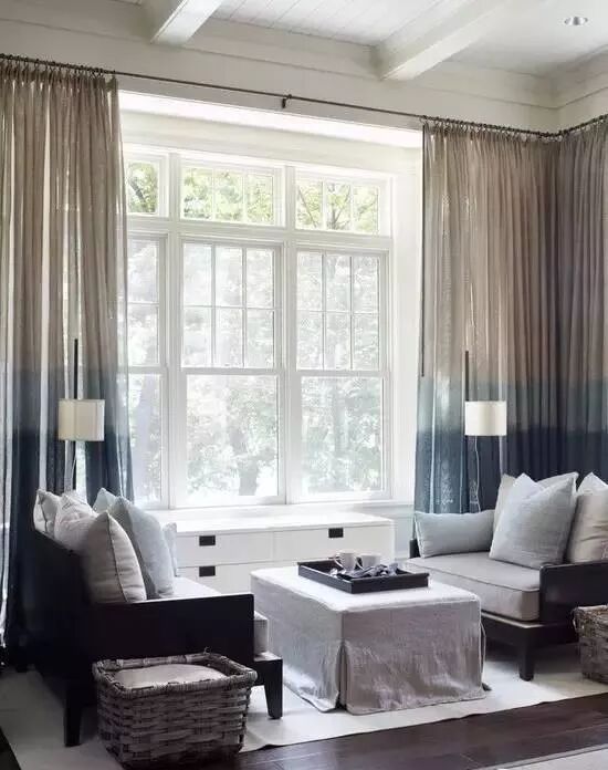 上下双色,上浅下深,且浅色区域多于深色区域款式的窗帘,视觉重心在下方深色区域,会使整个空间像向下延伸,也是拔高屋子的不错选择。