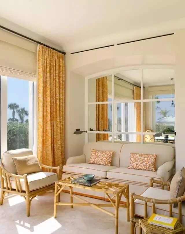 窗帘挂高几厘米就能让层高显得高出几公分,就像穿大长裙能显高是一个道理,从高于窗框上沿的13~18cm处开始悬挂效果较佳。