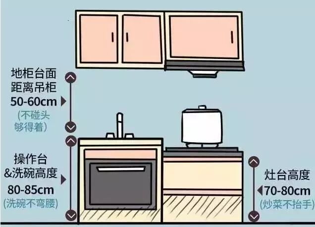 1、厨房的布局少不了的厨房三件套、橱柜,而对橱柜的设置,我们主要设计到地柜、台面等之间的距离