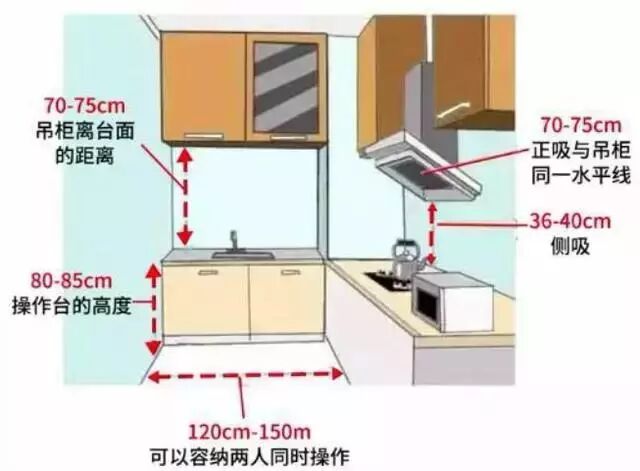 2、那在我们安装的时候,要注意吊柜与台面,以及地柜的高度,还有就是油烟机与灶台之间的高度。