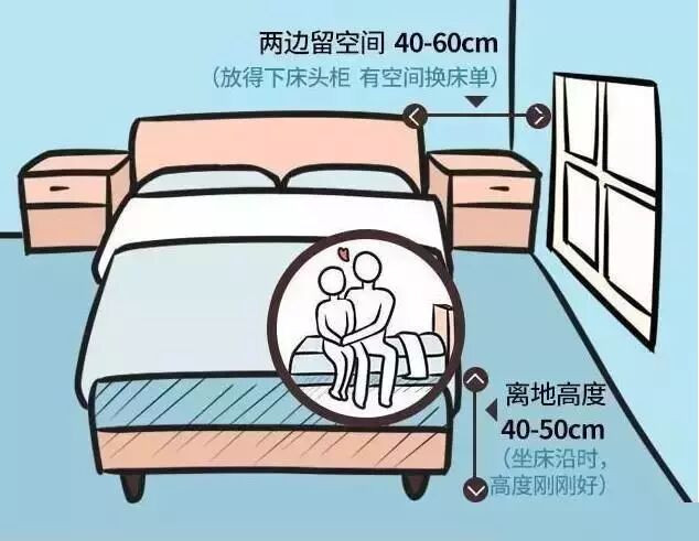 床在整个卧室中的占比是最大的,那最佳的摆放空间距离是床的两侧至少要预留40-60cm的空间,因为你要考虑到床旁边要摆上床头柜。