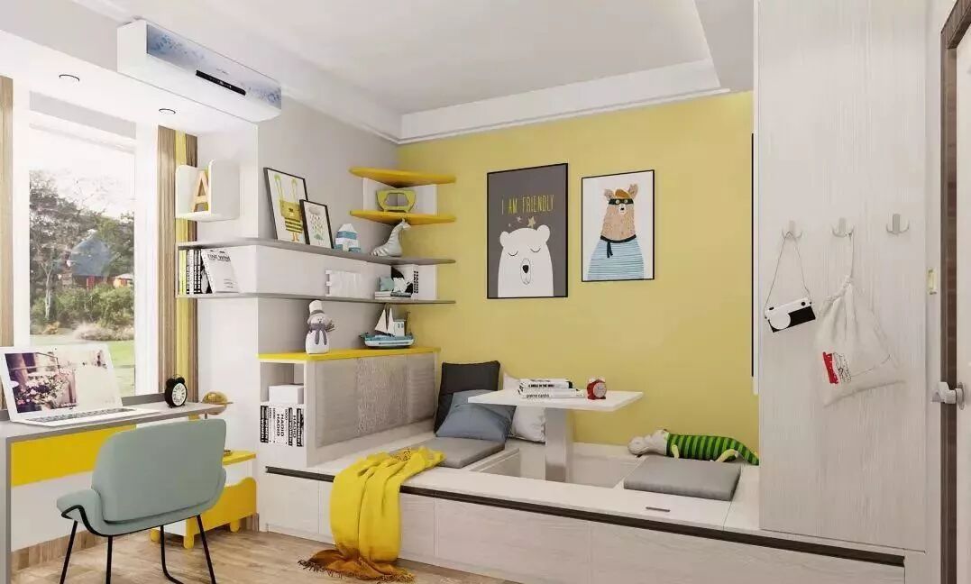 儿童房的一面墙刷成芒果黄,柜子上也用点黄色,搭配童趣的挂画,空间更加有生气。