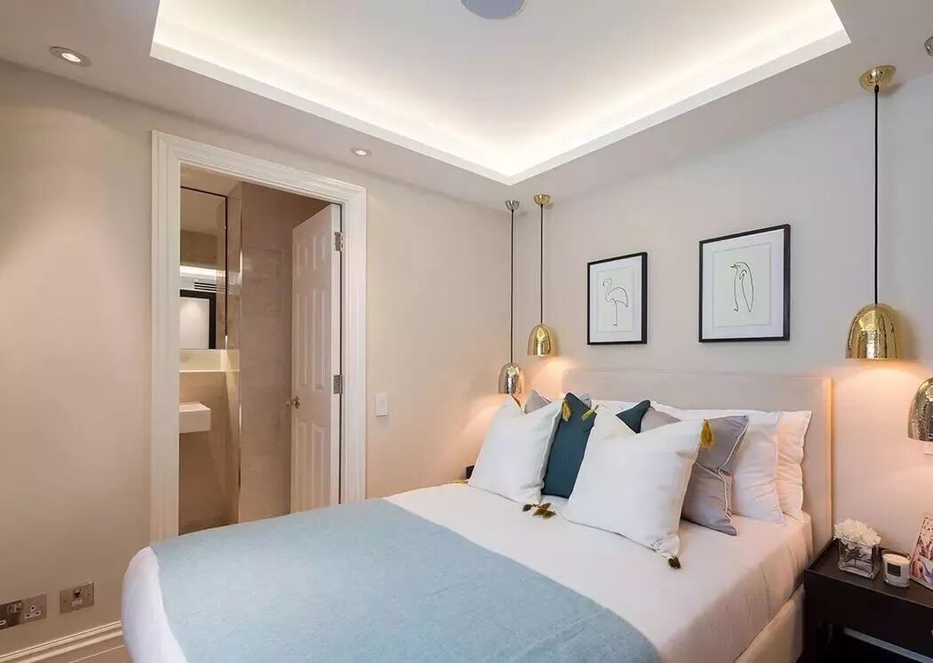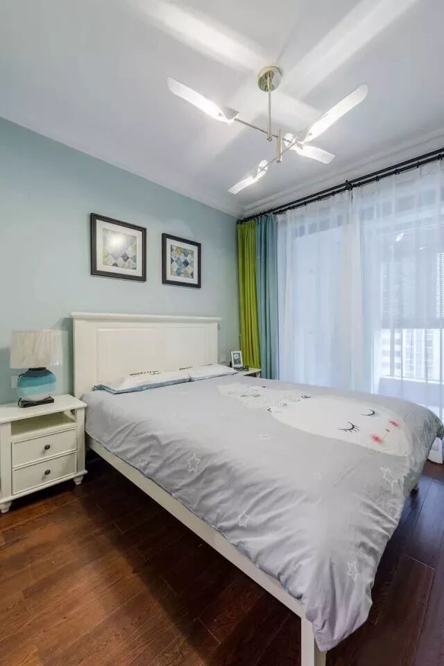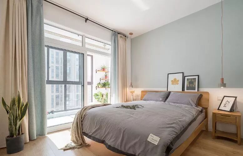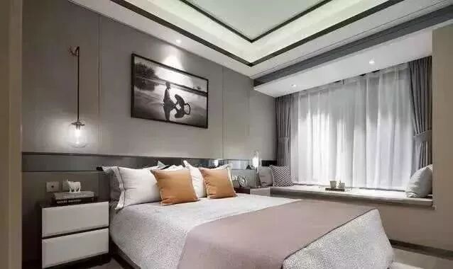 加入一些温馨的暖色系,主卧看起来就相对没有那么硬,营造出舒适浪漫的睡眠氛围,背景墙拦腰处理更显空间立体感。