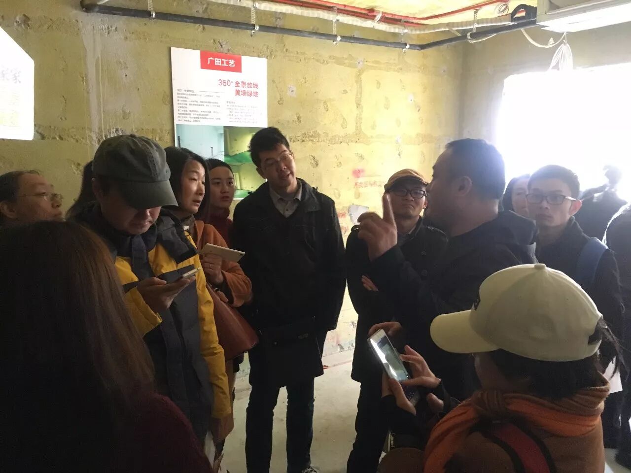工地正处于水电施工阶段,重点考察水电施工情况,了解360度全景放线、黄墙绿地、防水渗漏及强弱电、水路优化分组布设工艺。