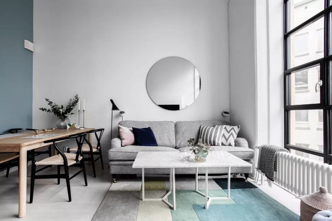 ▲ 黑白基调的空间中,摆放一张灰色布艺沙发,利用一面圆镜作背景造型,几何色块地毯搭配大理石茶几